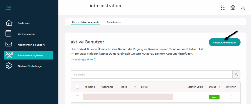 Hier sehen Sie die Übersicht aktive Benutzer. Über den Button + Benutzer einladen können Sie einen neuen Nutzer hinzufügen.