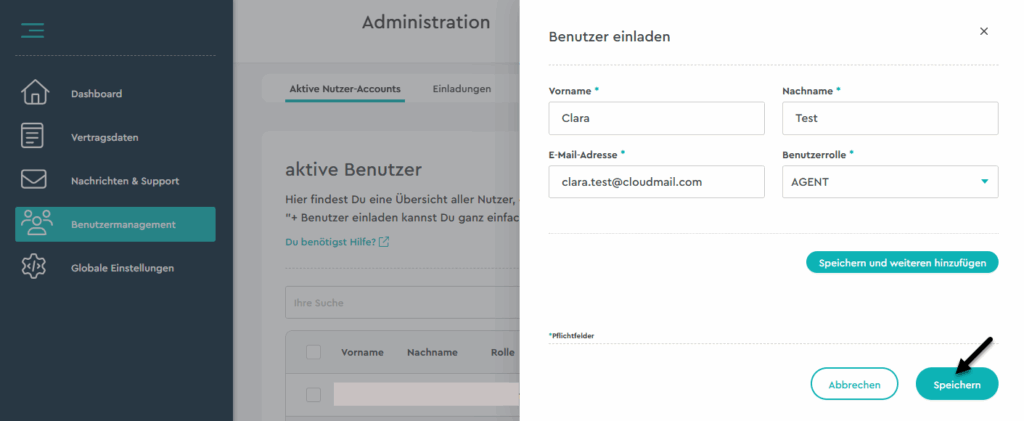 Tragen Sie hier Vor- und Nachnamen, E-Mail-Adresse und die gewünschte Benutzerrolle ein.