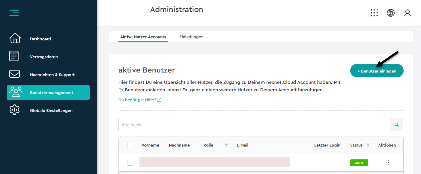 Hier sehen Sie die Übersicht aktive Benutzer. Über den Button + Benutzer einladen können Sie einen neuen Nutzer hinzufügen.