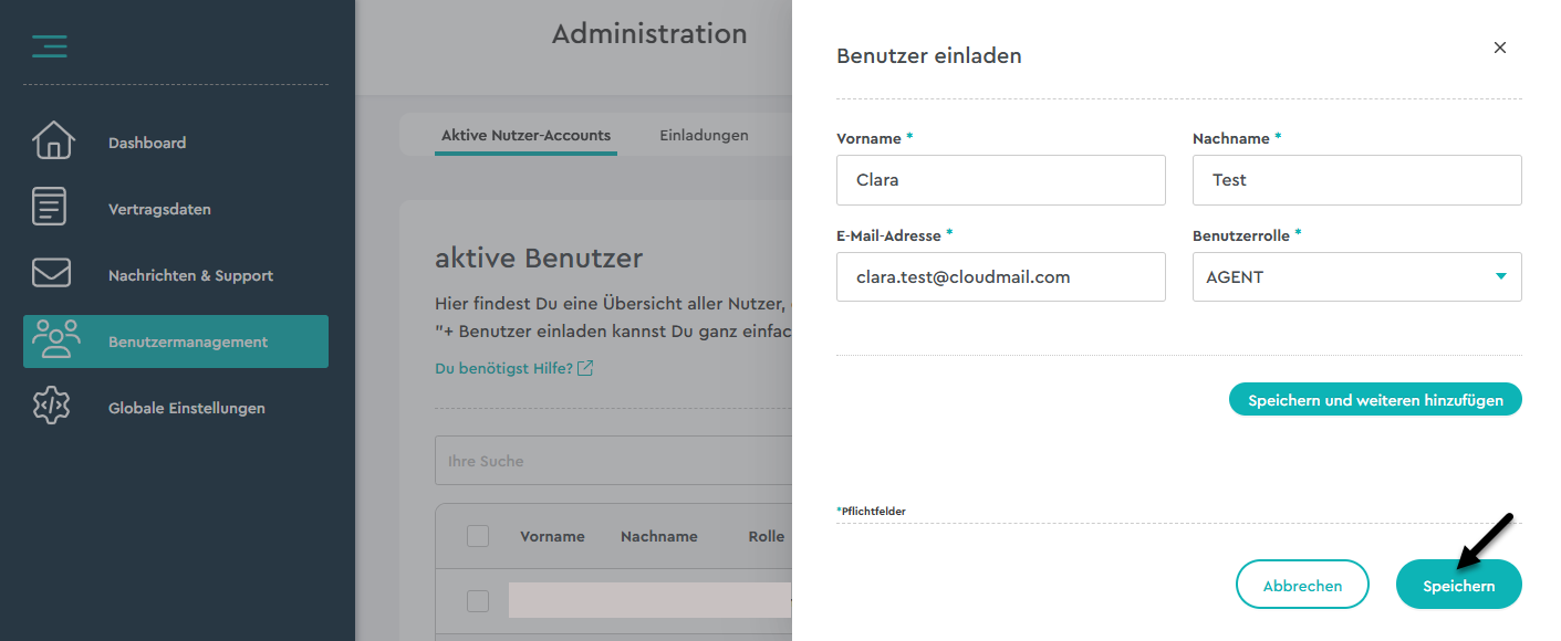 Tragen Sie hier Vor- und Nachnamen, E-Mail-Adresse und die gewünschte Benutzerrolle ein.